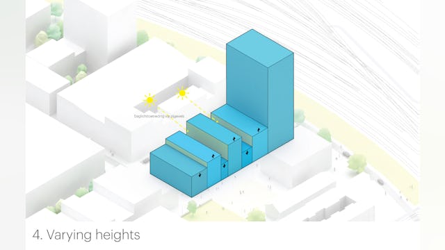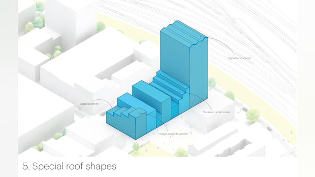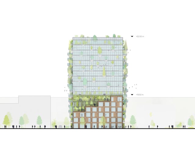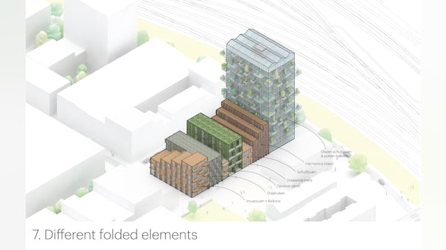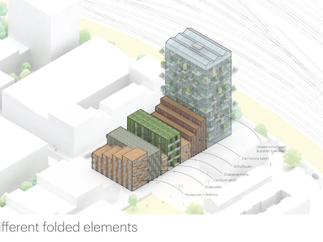 In navolging van de historische pakhuizen opent een aantal gevels zich door middel van klap- en vouwluiken, klap- en vouwbalkons en klap- en vouw luifels. Het klappen, schuiven en scharnieren zorgt voor een levendig pallet van gevels. Naast een zonwerende en thermische kwaliteit bieden de luiken, luifels en schuifpuien ook privacy voor bewoners – zij kunnen de gevel kan naar wens open en dicht zetten. Het complex verloopt getrapt; terrassen vormen de overgang van het laagste laagbouwpand naar de hoogbouw. De daken van de lagere panden worden geactiveerd en krijgen daktuinen, een appelboomgaard, urban farming of een dakbos.