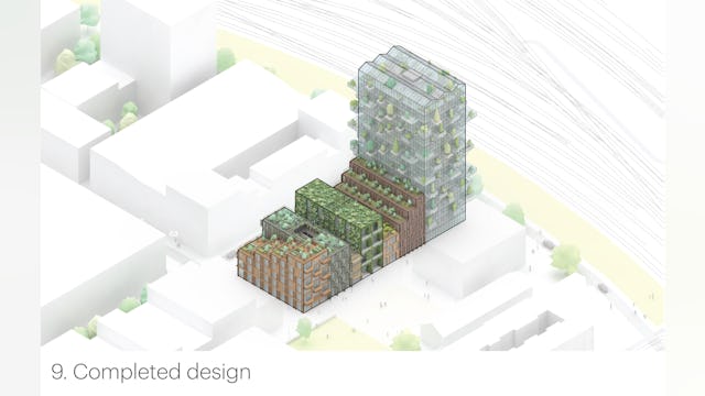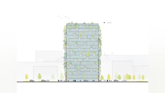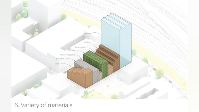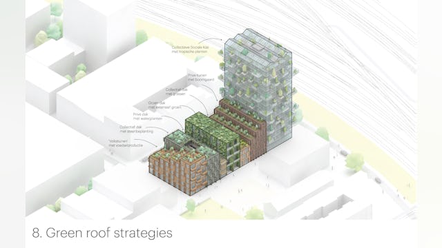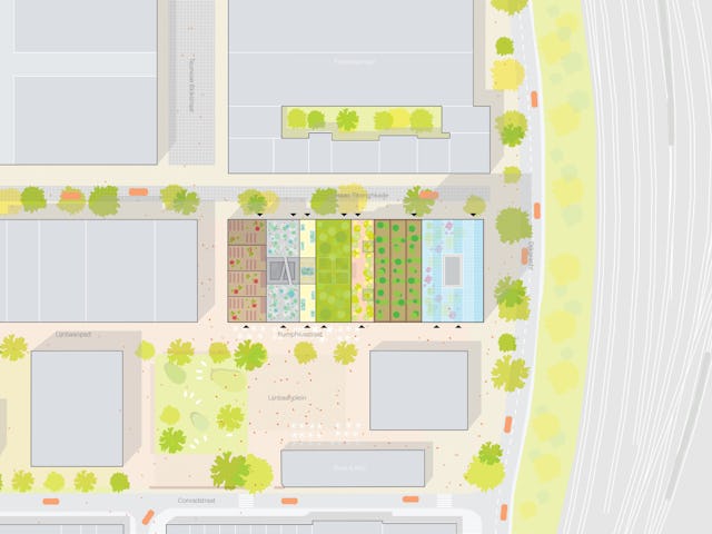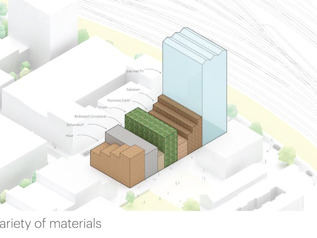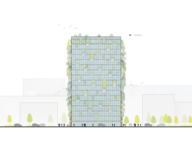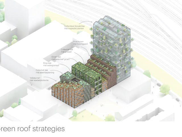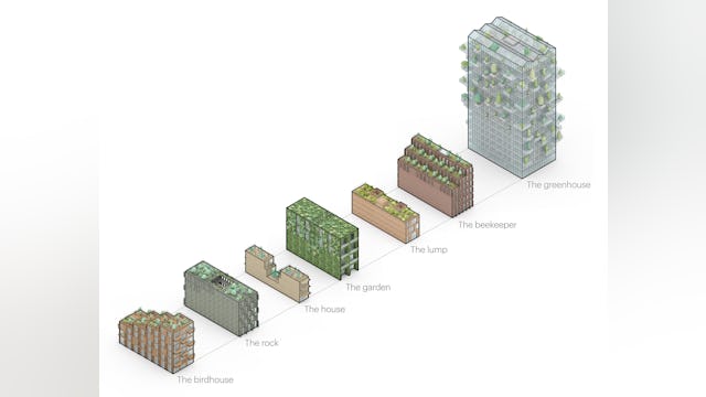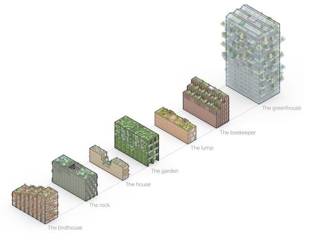 Elk gebouw heeft zijn eigen groene uitstraling en naam – de kas, het vogelhuis, de rots, het huis, de imker, de tuin, de klont – en een gevel die bijdraagt aan vergroening van de stad. Het hele project kan worden gezien als een groen laboratorium, of groene expo. Naast ‘onzichtbare’ technische oplossingen om zeer lage uitstoot te genereren zijn er ook talloze praktische ingrepen om tot een holistische duurzame visie te komen.