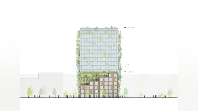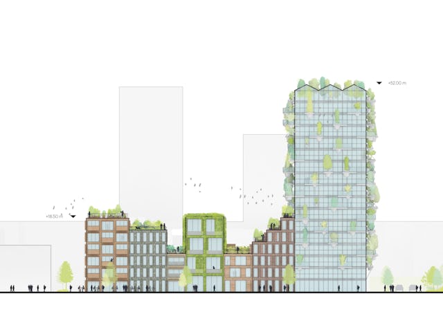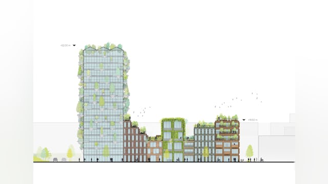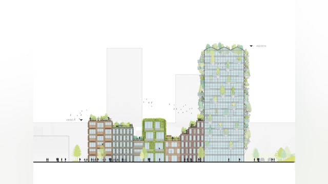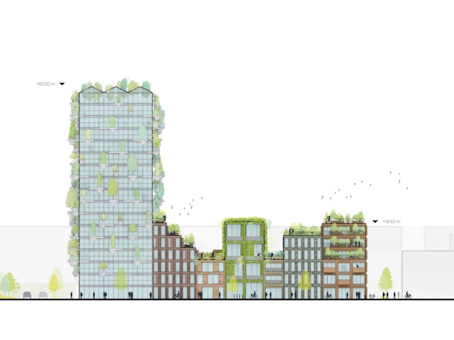 ‘De Oosterlingen wordt een groen complex dat in mijn ogen niet alleen goed is voor mensen maar ook voor vogels en insecten. We maken een pand van gestampte aarde, een oeroude en duurzame bouwmethode, een ander pand krijgt een volledig groene gevel. Ook in verschillende gevels zijn nestkasten geïntegreerd voor huismussen, gierzwaluwen en vleermuizen.