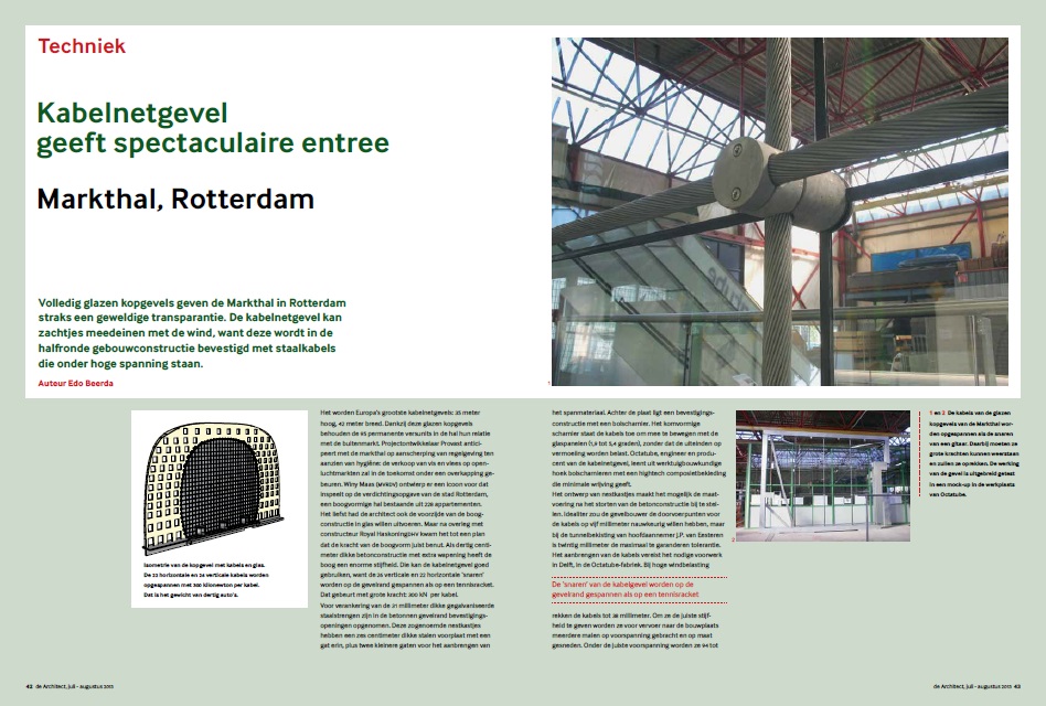 Volledig glazen kopgevels geven de Markthal in Rotterdam straks een geweldige transparantie. De kabelnetgevel kan zachtjes meedeinen met de wind, want deze wordt in de halfronde gebouwconstructie bevestigd met staalkabels die onder hoge spanning staan.