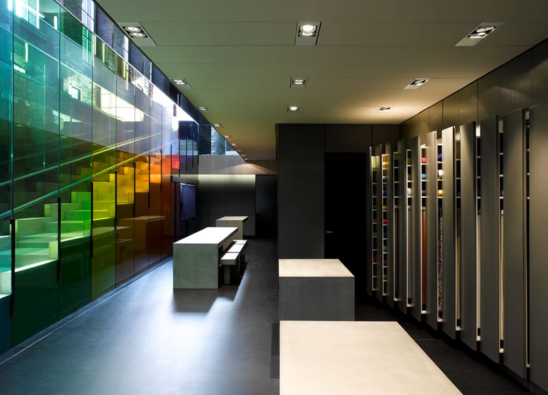 De samenwerking tussen grafisch ontwerper Peter Saville en architect David Adjaye voor de showroom van de Deense stoffenfabrikant Kvadrat is een subtiele les in het gebruik van kleur. In wat een strenge, sobere omgeving zou kunnen zijn, hebben de ontwerpers verrassende flitsen kleur toegevoegd, die de showroom doen barsten van de energie.