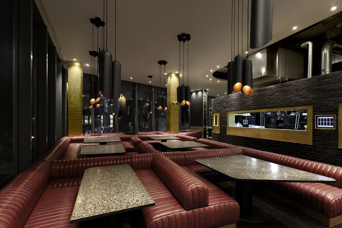 Amerikaanse culinaire tradities als vlees grillen en roken zijn het uitgangspunt van het nieuwste restaurant van Jamie Oliver in Londen. Het interieurbureau van de Britse ontwerper Tom Dixon maakte hiervoor een macho showinterieur, bestaande uit baksteen, staal en leer, met gouden accenten.