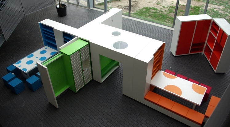 In openbare basisschool Het Zand in Utrecht staat de eerste uitklapbare BSO, ontworpen door het Rotterdamse architectenbureau No Label. Met dit flexibele meubel is de aula na schooltijd gemakkelijk om te vormen tot een buitenschoolse opvang. Het is één van de drie pilots die de gemeente Utrecht in 2009 is gestart om de wachtlijsten in de kinderopvang weg te werken.